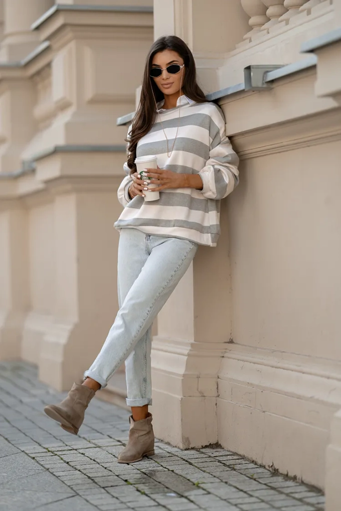 • Dámský svetr s kulatým výstřihem z příjemného materiálu v pruhovaném vzoru. Model má dlouhé rukávy. Ideální základ pro zimní outfity!