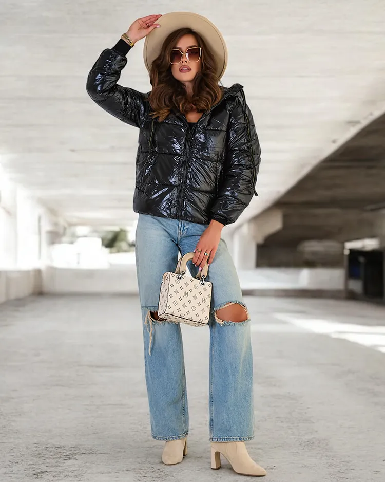 - Teplá dámská zimní bunda. Prošívaný model, má 2 kapsy na zip, syntetickou péřovou výplň a zapínání na zip. POZNÁMKA: Přesnost měření (+/-) 1 cm.