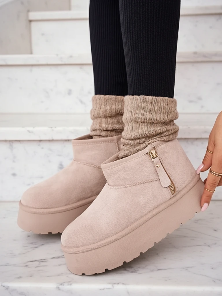 - Skvělé dámské zimní sněhule na platformě. Svršek je vyroben z ekologické semišové kůže, uprostřed je zateplený kožíškem. Model se zapíná na ozdobný zip. Ideální základ na zimu!