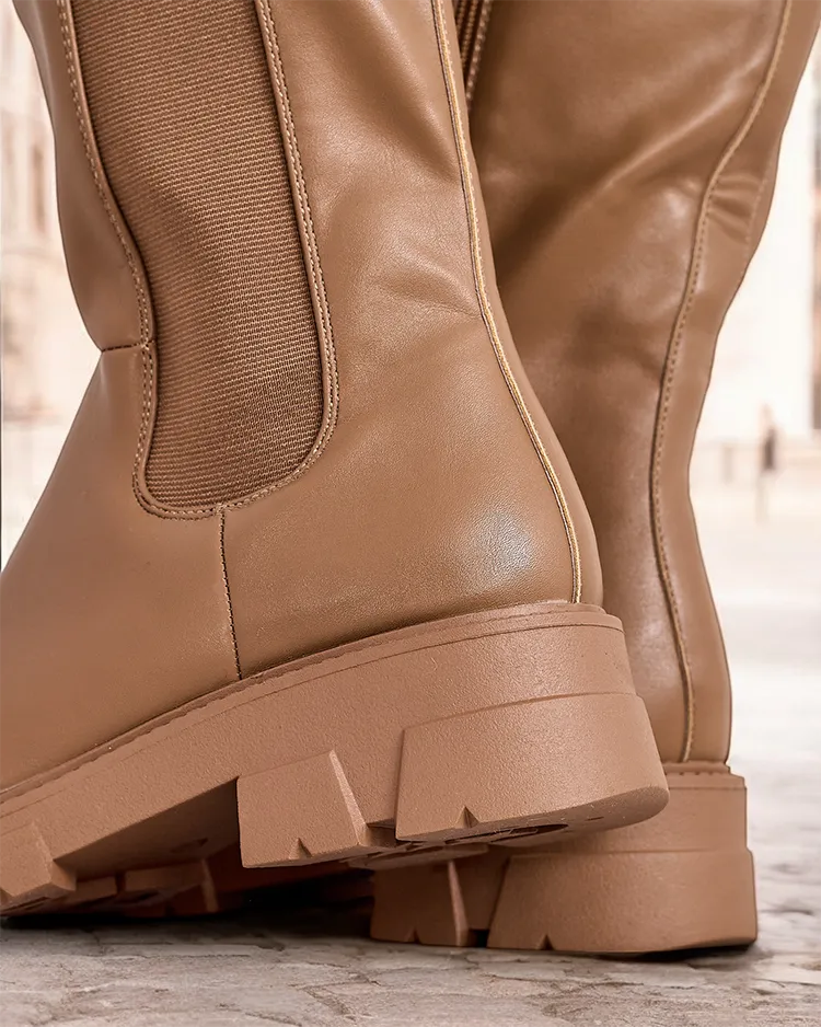 - Stylové dámské kozačky nad kolena s plochým podpatkem. Svršek je vyroben z ekokůže, uvnitř je látková stélka. Model se zapínáním na zip má pružnou vsadku. Ideální pro každodenní podzimní outfity!