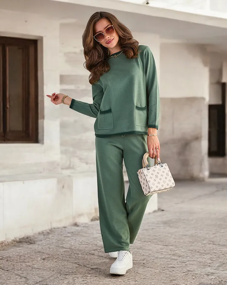 - Dámský svetrový set z příjemného materiálu. Svetr s kulatým výstřihem má dlouhé rukávy. Široké kalhoty jsou s gumou a zavazují se v pase. Must have této sezóny! POZNÁMKA: Přesnost měření (+/-) 1 cm.