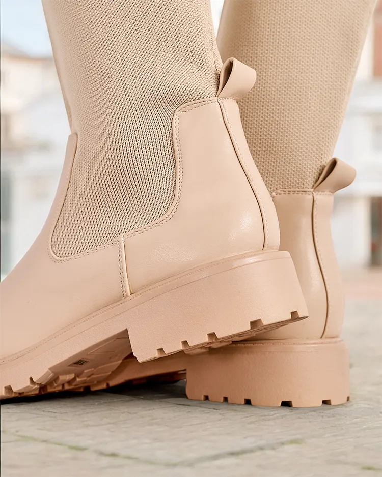 - Stylové dámské kozačky na vysokém podpatku. Horní část je vyrobena z pružné látky s vložkami z ekokože, uvnitř látková podšívka a kožichová stélka. Model slip-on. Skvělé pro každodenní podzimní outfity!