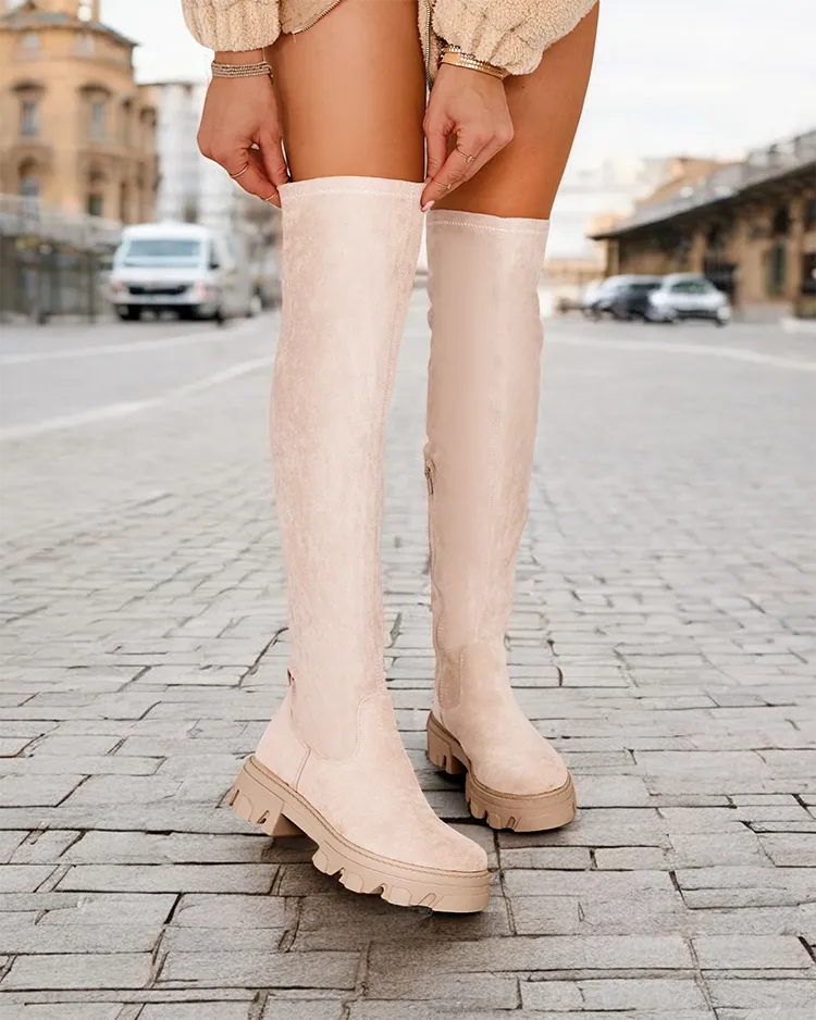 - Stylové ženské slip-on boty s plochou podrážkou přes koleno. Zvrchní část je vyrobena z eko semiše, s látkovou vložkou uvnitř. Model se zavíráním na zip po polovině lýtkové části. Skvělé pro každodenní podzimní oblečení!