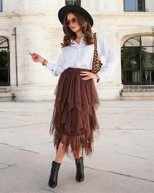 - Klasická dvouvrstvá midi sukně pro ženy. Model má podšívku a tyl ve formě sítě, stejně jako široký elastický pas, který dokonale zdůrazní pas. Tato sukně je skvělým doplňkem k vašemu každodennímu outfitu!