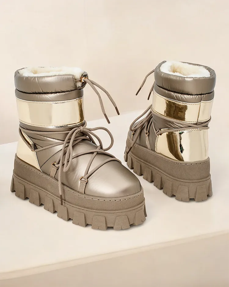 - Dámské sněhové boty s hřbetem vyrobeným ze směsi látky připomínající voskovou plachtu a patentové ekokože. Uvnitř je příjemná kožichová podšívka, slip-on a šněrovací boty. Ideální na zimu!