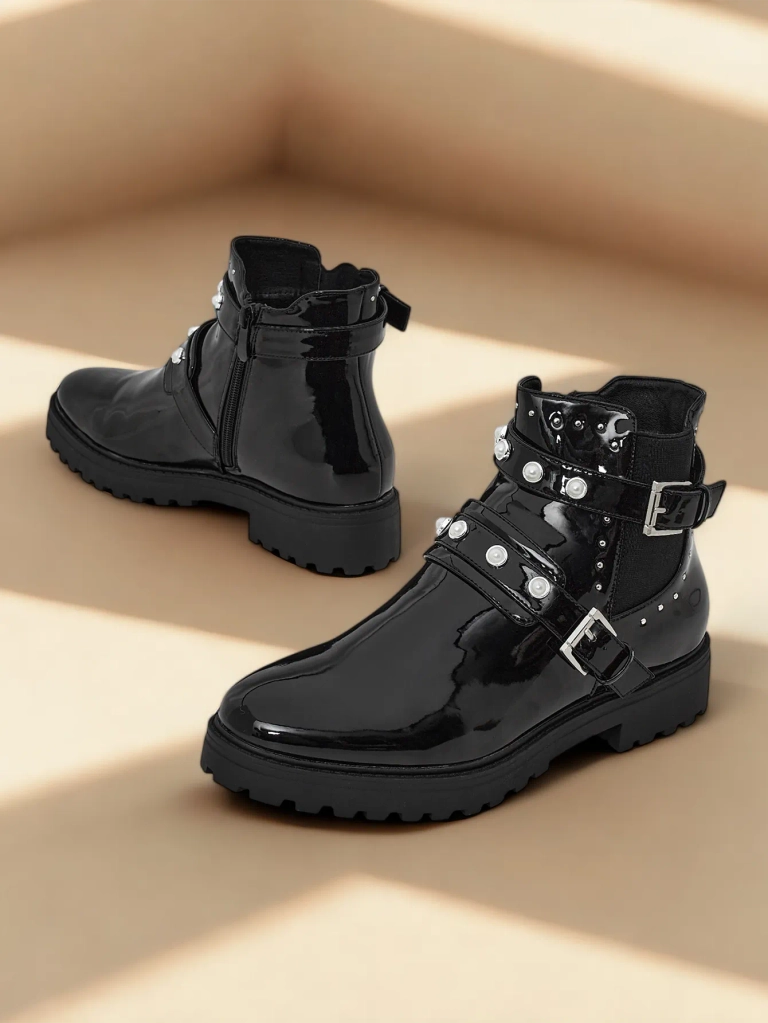 - Stylové boty vyrobené z lakové imitace kůže. Boty se zapínají na zip, mají tlustou, pryžovou podrážku a podšívku v podobě jemného kožešinového lemu. Model je zdoben elegantními ozdobami na svršku. Na podzim si je obuj pro stylový vzhled!