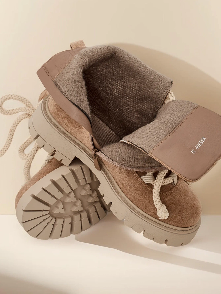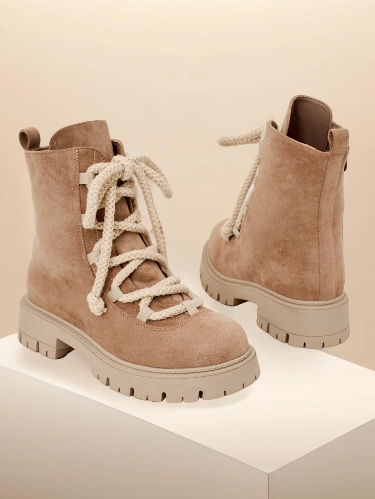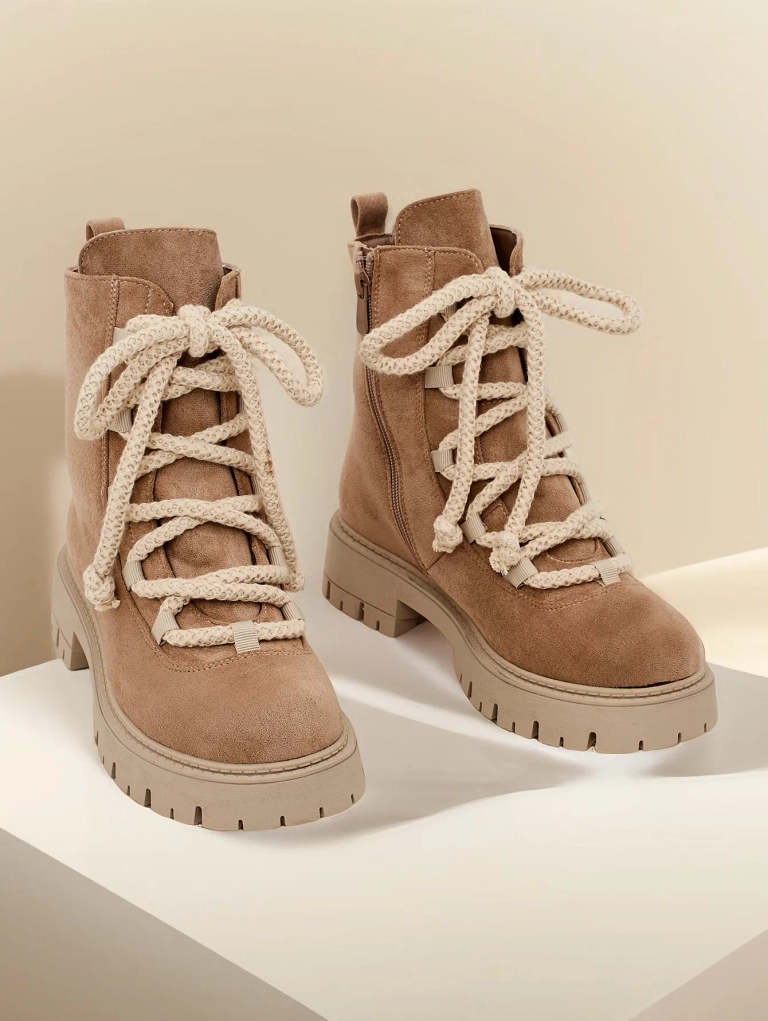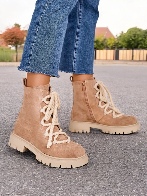 - Stylové kozačky s šněrováním vyrobené z ekokoženého semiše. Boty jsou svázány a zapnuté zipem. Model má tlustší podrážku a podšívku z kožešiny. Perfektní na podzim!