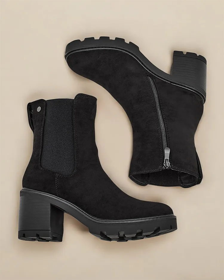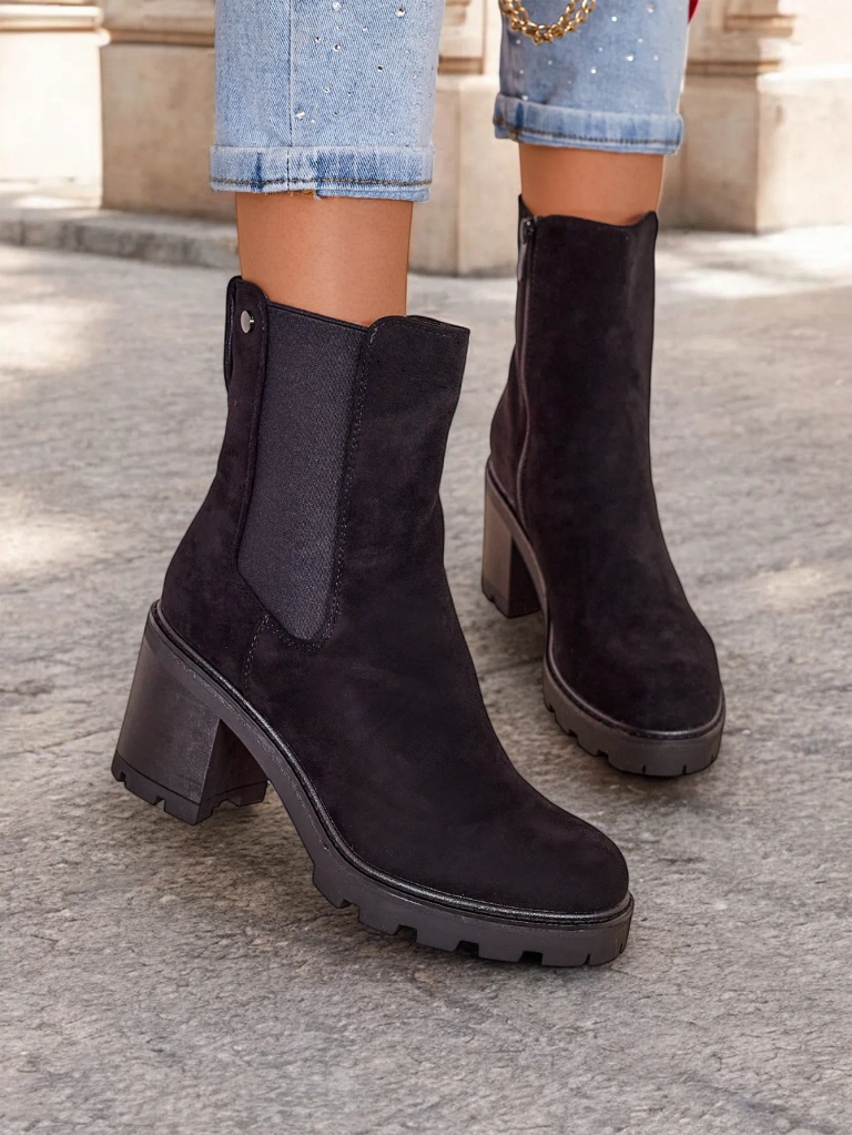 • Stylové dámské kotníkové boty jsou ideálním řešením pro chladnější dny. Horní část z eko-suede je zapínána na zip a vyplněna kožešinou. Model na opatku s kulatým nosem. Skvělý doplněk k vašim volným outfitům!