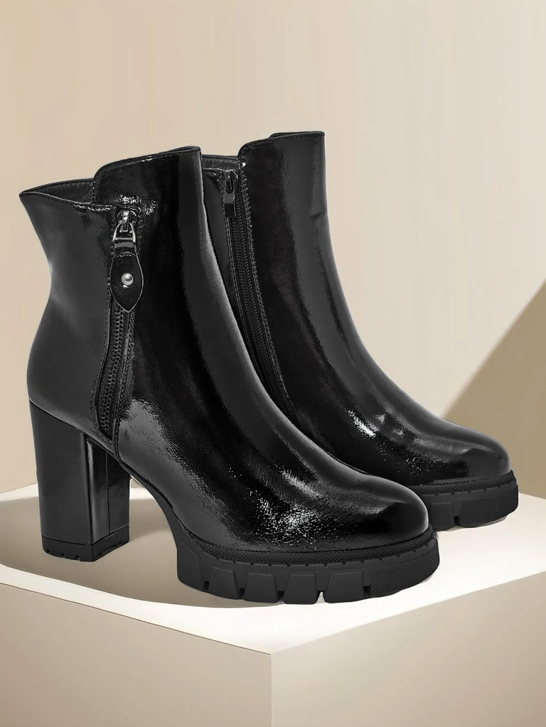- Lesklé ženské kotníkové boty jsou ideálním řešením pro chladnější dny. Vrchní část je vyrobena z ekokože a je zapínána na zip. Uvnitř je kožená stélka s kožešinou. Model na sloupci s kulatou špičkou. Skvělý doplněk k vašim volnočasovým outfitům!