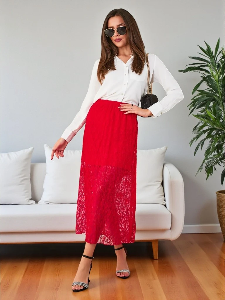- Dámská midi sukně vyrobená z lehké látky. Model s podšívkou a vnější vrstvou z krajky, s elastickým pasem. Ideální pro podzimní období! POZNÁMKA: Přesnost měření (+/-) 1 cm.