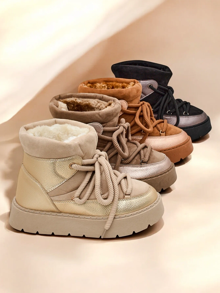 - Dámské sněhule s hřbetem vyrobeným z kombinace ekokůže a eko semiše. Uvnitř příjemný kožich, slip-on a boty se šněrováním. Perfektní na zimu!