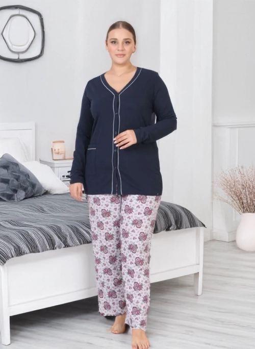 - Dámské dvoudílné pyžamo vyrobené z bavlněné látky s dekorativním potiskem. Součástí setu je blůza s dlouhými rukávy a knoflíky a kalhoty s elastickým pasem a přímými nohavicemi.
