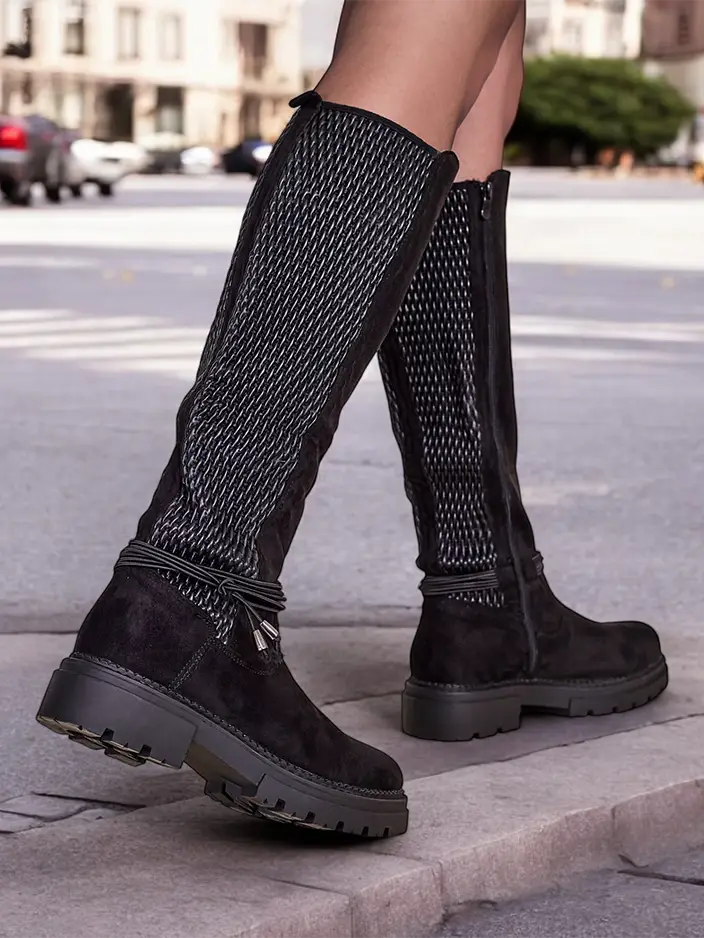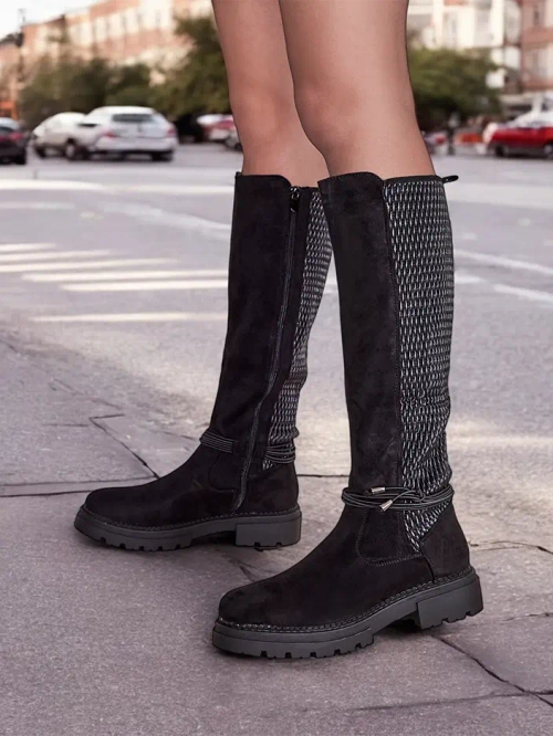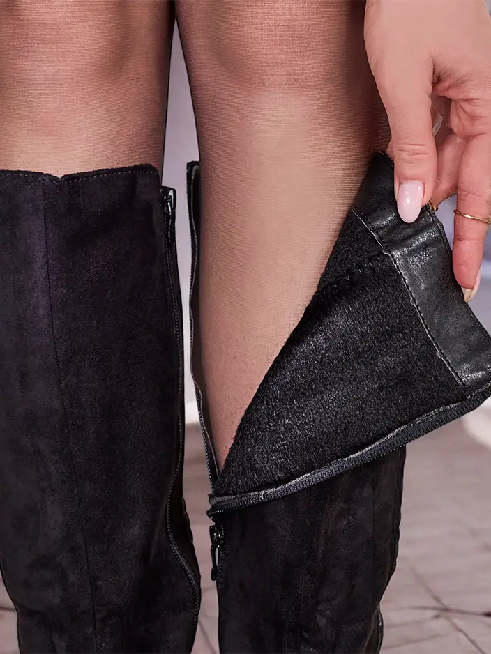 - Vysoké dámské boty vyrobené z ekologické semišové kůže s plochým podpatkem. Uvnitř s koženou stélkou. Model je zapínán na zip a má elastickou vsadku na zadní straně. Elegantní a stylové s odnímatelnou dekorací!