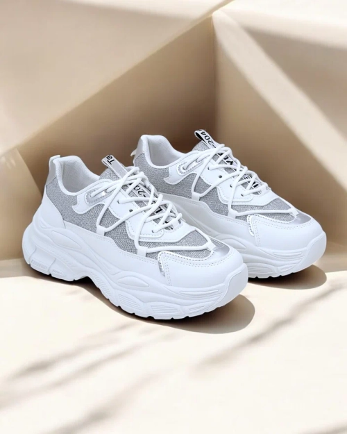 - Dámské sportovní boty ve formě tenisek na silnější podrážce. Vyrobeno z eko-kůže s lesklými prvky. Textilní stélka. Skvělý doplněk k vašim každodenním módním outfitům!