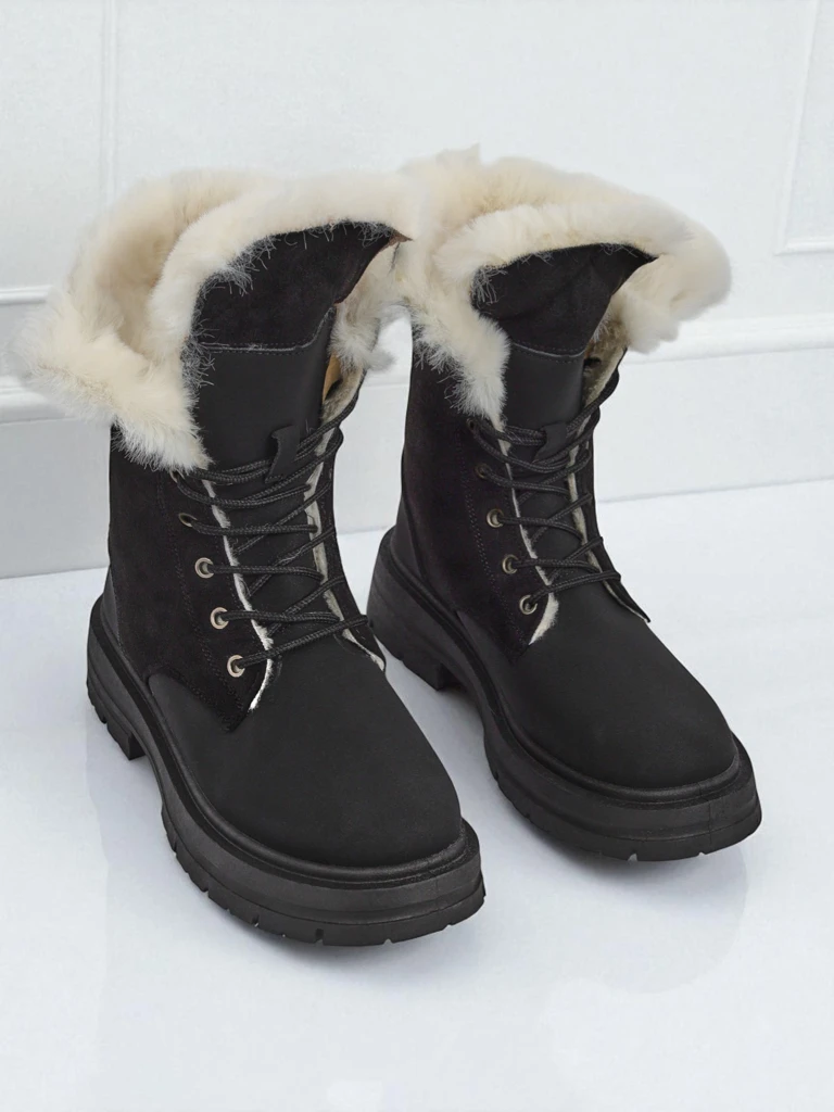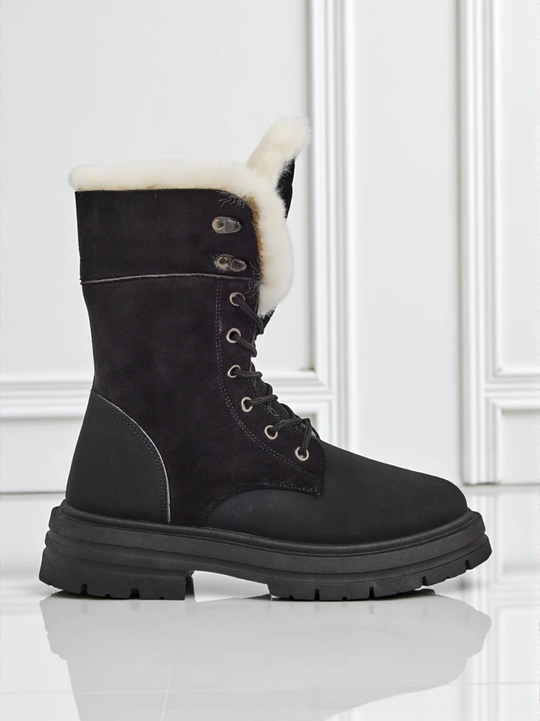 • Dámské kotníkové boty v šněrovacím stylu dokončené jemnou kožešinou. Použité materiály jsou matná ekologická kůže a semiš. Vnitřek bot je zateplený. Ideální na zimu!