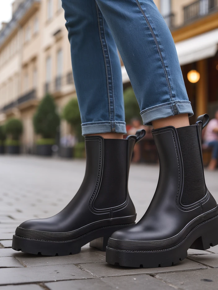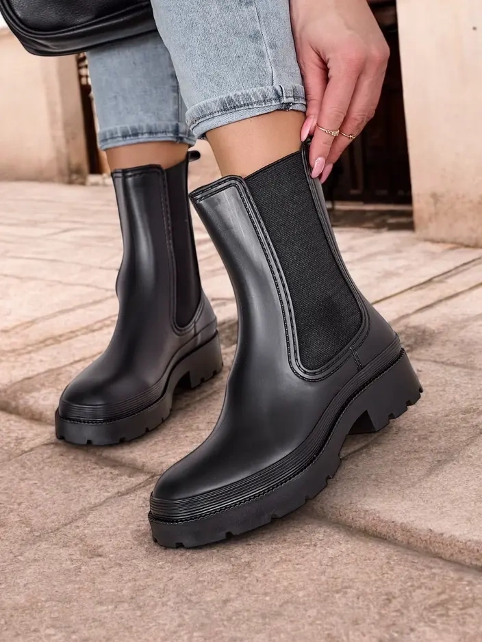 - Klasické dámské kotníkové boty na plochém podpatku, vyrobené z gumového materiálu. Uvnitř je textilní stélka. Elastické vsadky po stranách. Ideální na podzimní deštivé dny!