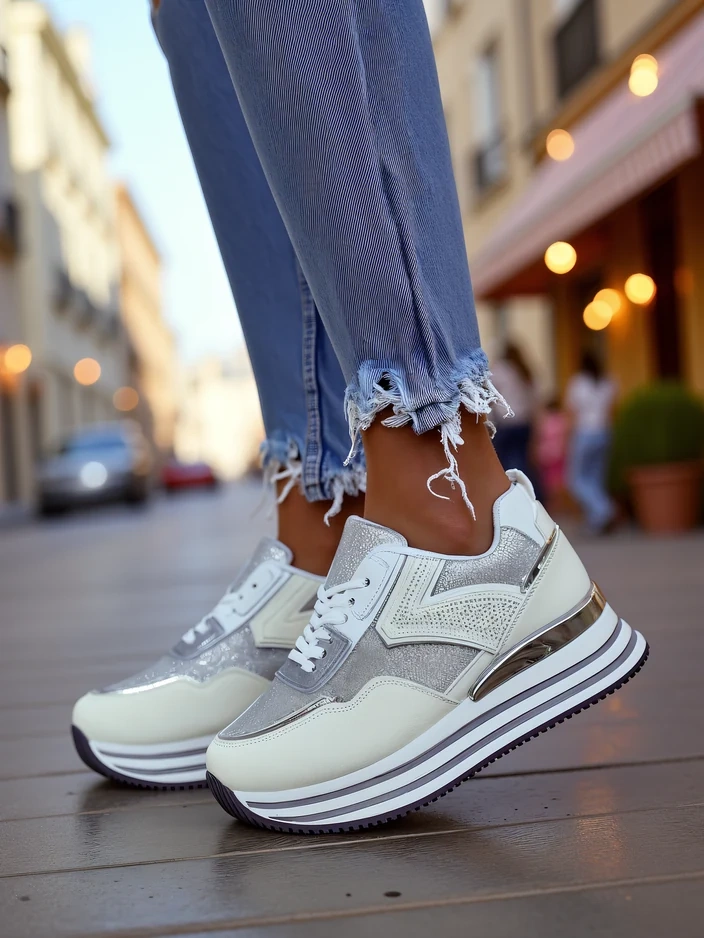 - Dámské sportovní boty ve stylu sneaker s tlustší podrážkou. Vyrobené z eko-kůže a třpytkového materiálu s textilní stélkou. Skvělý doplněk k vašim každodenním casual outfitům!