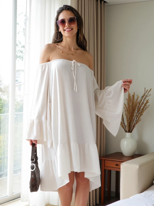 - Úžasné a'la španělské šaty, vyrobené z lehké, vzdušné tkaniny. Model do kolen s dlouhými rukávy zdobenými volánky a elastickým výstřihem, který zvýrazňuje siluetu. Plné kouzla a lehkosti!