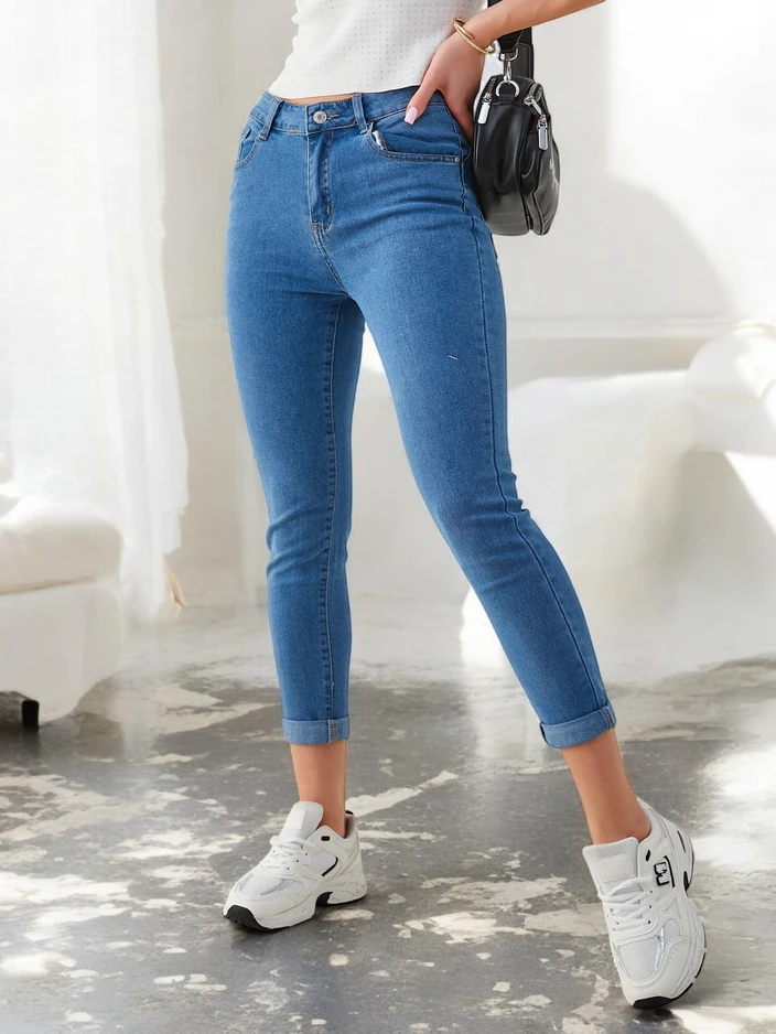 - Damské tapered džíny vyrobené z bavlněné látky. Střední pas, zapínání na knoflík a zip. Dva páry kapes - vzadu a vpředu.