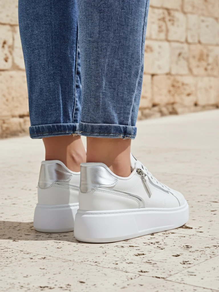 - Dámské sportovní tenisky na ploché podrážce, vyrobené z eko kůže. Model má textilní vložku a silnější podrážku. Noste je k širokým kalhotám a košili!
