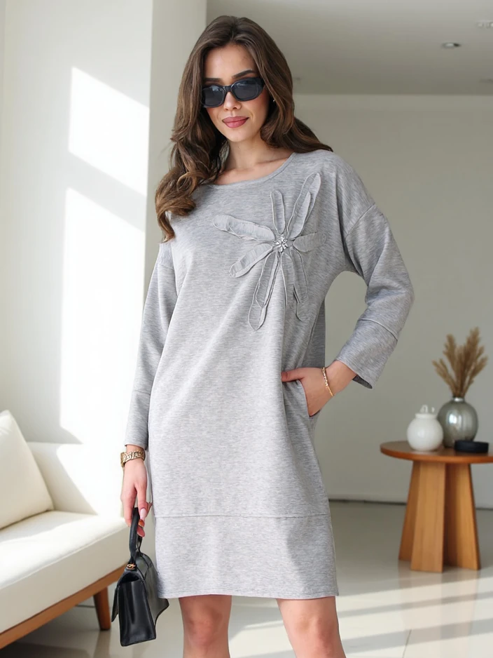 - Casual dámské šaty ke kolen s 3/4 rukávy a kulatým výstřihem. Model je zdoben ozdobnou květinou. Musíte mít tuto sezónu! POZNÁMKA: Přesnost měření (+/-) 1 cm. Rozměry měřeny v klidu.
