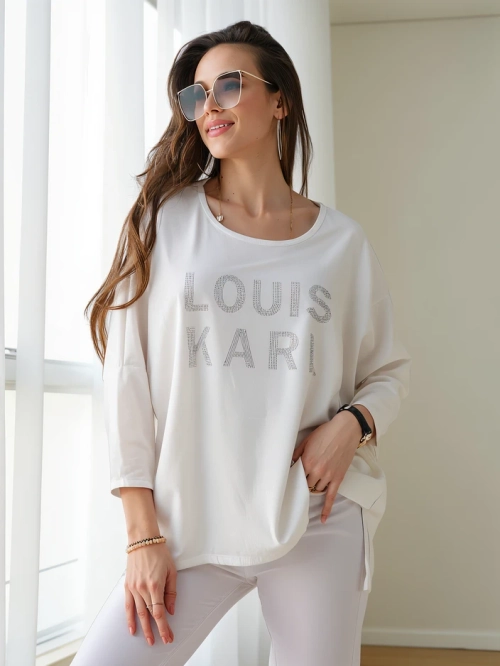 - Originální dámská blůza s kulatým výstřihem, vyrobená z měkké a příjemné látky na dotek. Celý kus je zdobený decentním nápisem z kamínků a dlouhý rukáv přidává na lehkosti. Skvělá volba pro vytváření módních a stylových outfitů!