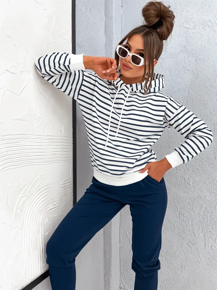 - Dámská souprava vyrobená z příjemného materiálu. Mikina přes hlavu s kapucí. Kalhoty s elastickým pasem a 2 kapsami. Ideální souprava na procházku! POZNÁMKA: Přesnost měření (+/-) 1 cm.