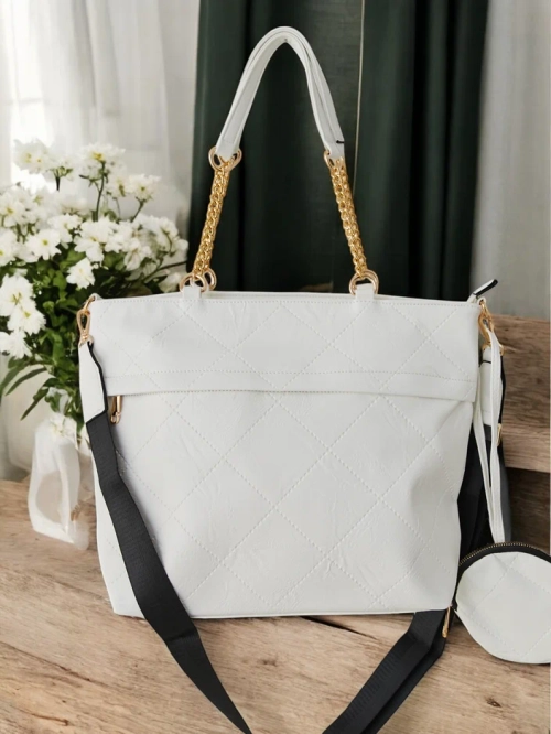 - Dámská kabelka se zipem, vyrobená z eko kůže. Model má 1 oddíl s přepážkou, 3 vnitřní kapsy a 1 vnější kapsu. Součástí je také peněženka a nastavitelný popruh. Ideální pro každodenní použití!