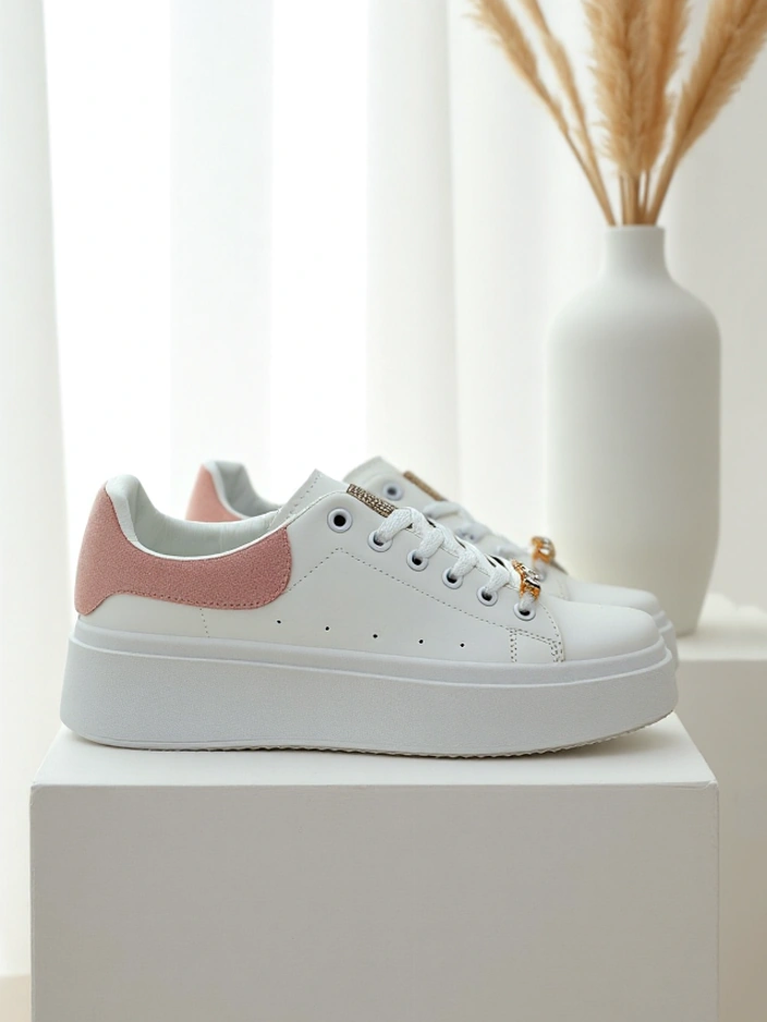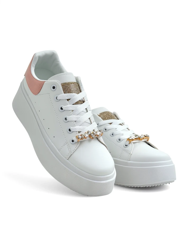 • Elegantní bílé tenisky s třpytivým kovovým detailem. Obuv vyrobená z ekologické kůže a textilních vložek. Ideální pro každodenní outfity.