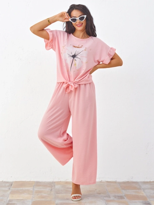 - Dámský set vyrobený z příjemné látky. Halenka má kulatý výstřih, krátké rukávy, potisk a mašličku. Široké kalhoty mají elastický pas. Nutnost této sezóny! POZNÁMKA: Přesnost měření (+/-) 1 cm.