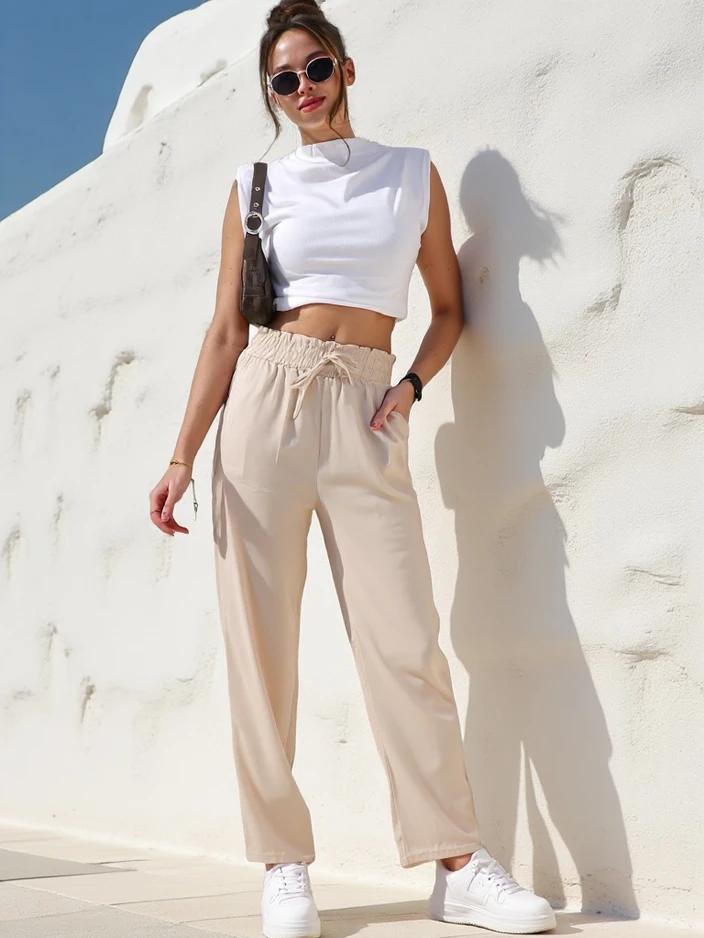 - Širší kalhoty vyrobené z lehké látky, model má elastický pas a dvě kapsy. Pohodlné a útulné! POZNÁMKA: Přesnost měření (+/-) 1 cm.