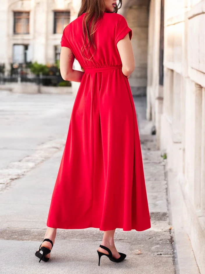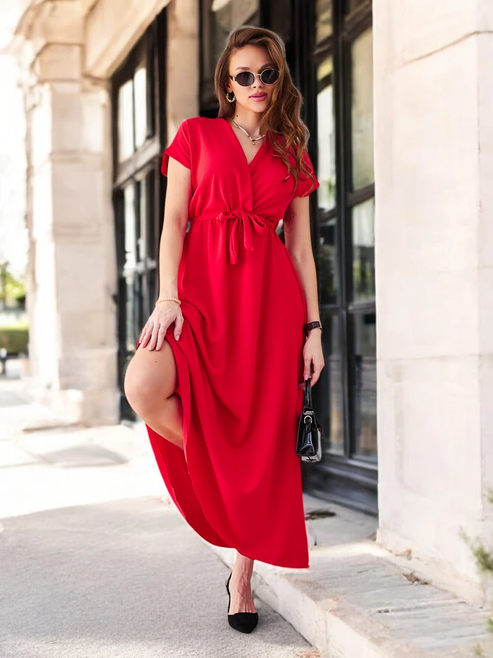 Royalfashion Dámské midi šaty s překříženým výstřihem, krátkými rukávy a opaskem