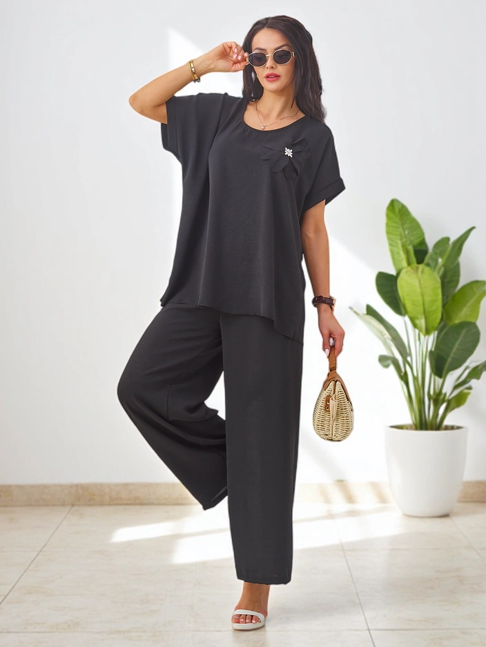 Royalfashion Dámský set s krátkým rukávem, ozdobený květinovým motivem a širokými kalhotami