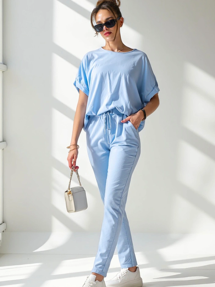 - Dámský volnočasový set z příjemného materiálu. Blůza se přetahuje přes hlavu, má krátké rukávy a kulatý výstřih. Rovné kalhoty s elastickým pasem. Ideální pro ty, kteří si cení pohodlí.