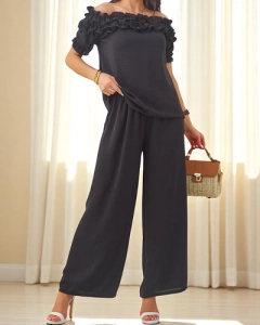 Royalfashion Dámský set s topem přes ramena s krátkým rukávem a zdobeným dekoltem a rozšířenými kalhotami