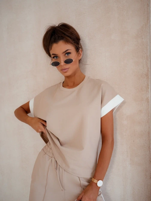 - Dámský casual set vyrobený z příjemného materiálu. Halenka se obléká přes hlavu, má krátké rukávy a kulatý výstřih. Široké kalhoty s elastickým pasem. Ideální pro ty, kteří si cení pohodlí.