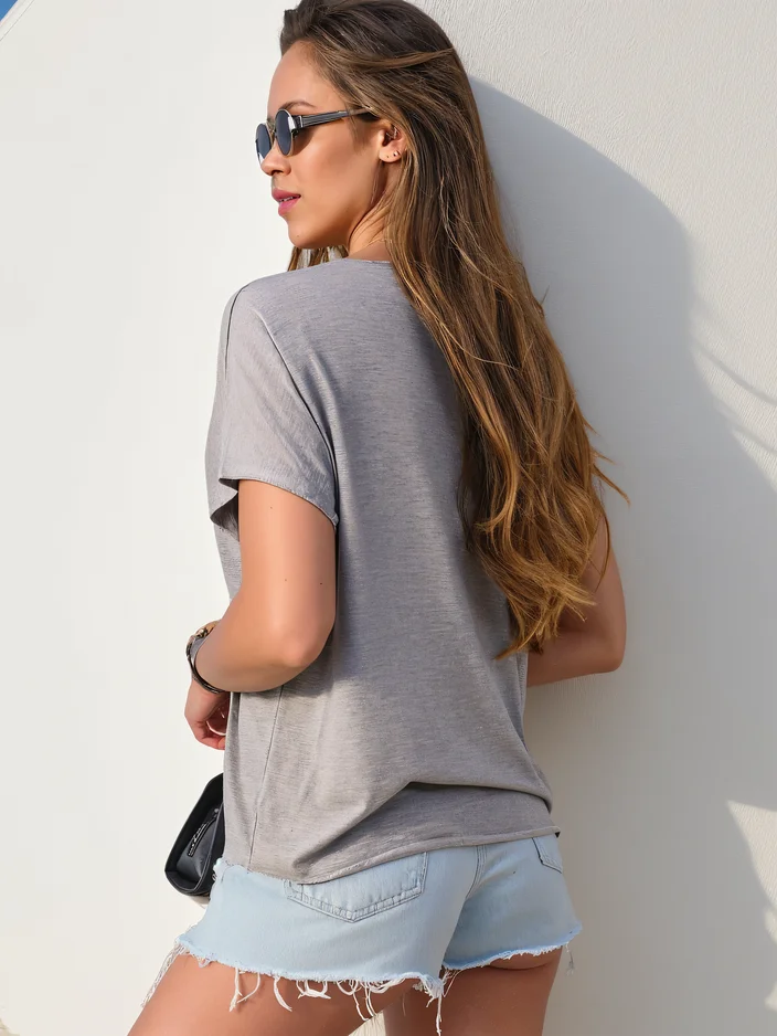 - Viskózová dámská blůza s krátkými rukávy a třpytivým povrchem – lehká, lesklá a plná jemného třpytu, ideální pro večerní vycházky.