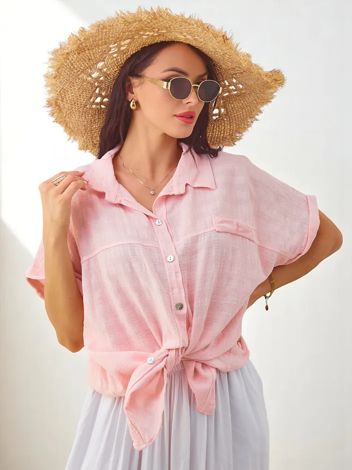 - Bavlněná dámská košile s embosováním a krátkým rukávem. Model s výstřihem do V, zapínání na knoflíky. Musí mít v každém dámském šatníku!