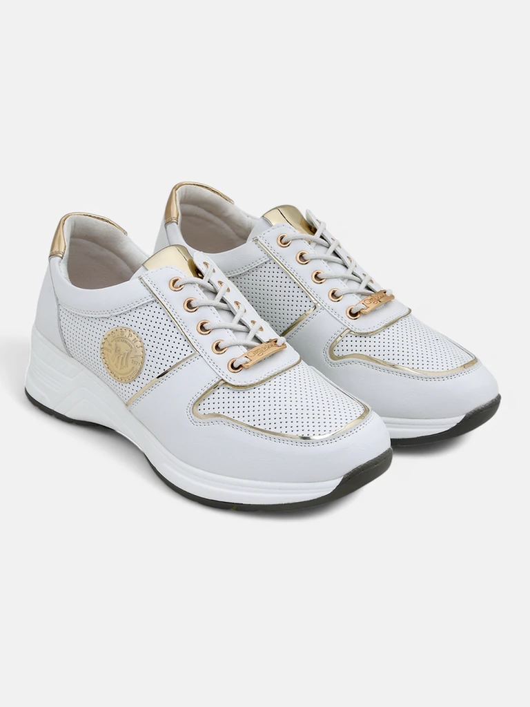 Dámské tenisky Calista Athena jsou výjimečné boty, které kombinují pohodlí sportovní obuvi s nádechem zeštíhlujícího a elegantního klínku o výšce 4 cm. Svršek je vyroben z vysoce kvalitní ekologické kůže, která je dodatečně perforovaná pro lepší ventilaci a zdobená zlatými akcenty, což zaručuje trvanlivost a luxusní vzhled. Vnitřek je vystlán přírodní, měkkou kůží, která zajišťuje nohám maximální pohodlí a zabraňuje oděrkám i při mnohahodinovém nošení. Boty jsou neuvěřitelně lehké, stabilní a navržené v souladu s moderními trendy – harmonicky kombinují ležérní styl se sportovním charakterem. Ideální na jaro, léto a podzim, díky perforacím noha dýchá i v teplejších dnech a klínek decentně prodlužuje siluetu. - Ekologická kůže s prémiovou úpravou – materiál odolný a bezpečný pro životní prostředí. - Přírodní stélka minimalizuje únavu nohou a zaručuje prodyšnost. - Zlaté detaily dodávají originalitu a eleganci každé stylizaci. - Stabilní klínek a protiskluzová podrážka zajišťují pohodlí i při celodenním používání. 1. Pro každý den – kombinujte tenisky se světlými slim džíny a oversized bundou. 2. Ležérní elegantní vzhled – postarejte se o pohodlí na víkend, kombinujte je s plisovanou midi sukní a basic tričkem. 3. Na schůzku nebo do práce – vsaďte na béžové, látkové cigaretové kalhoty a elegantní sako. Tenisky Calista Athena se také skvěle hodí k letním šatům nebo sportovní mikině a zapadají do aktuálních trendů athleisure a casual elegance. Pro zachování dokonalého vzhledu bot je otírejte měkkým, vlhkým hadříkem a vyhýbejte se namáčení – pravidelně čistěte suchým kartáčem na eko-kůži. Vnitřek z přírodní kůže lze osvěžit jemnými spreji pro péči. Obuv skladujte na suchém místě, vyhýbejte se přímému slunečnímu záření a zdrojům tepla. Bílé tenisky na klínku s metalickými zlatými akcenty jsou v současné době jedním z největších módních hitů. Ženy je oceňují pro pohodlí, univerzálnost a stylovou, sportovní eleganci.