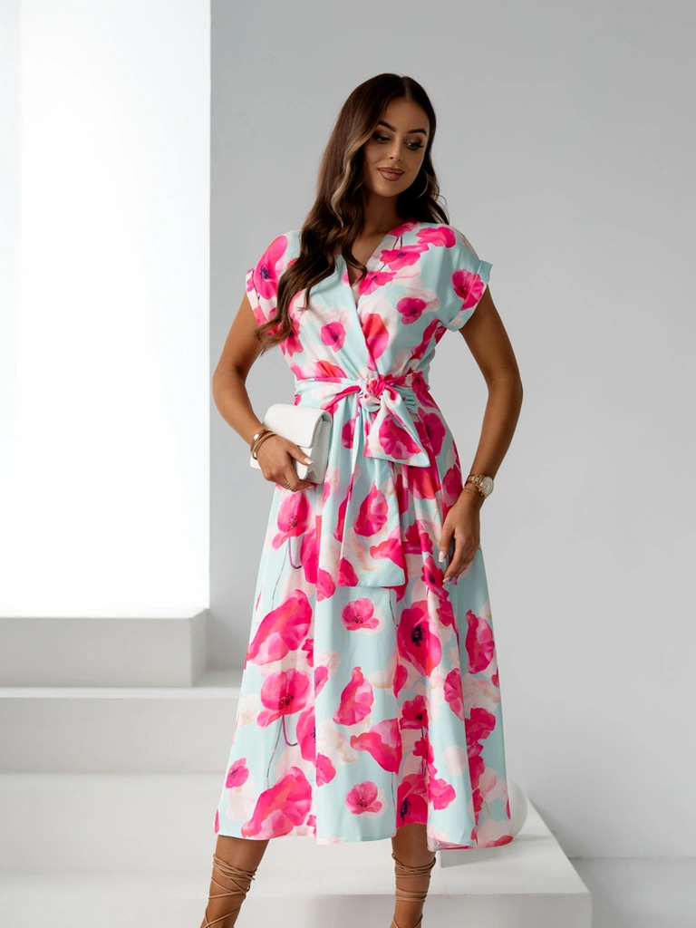 - Midi šaty pro ženy s krátkým rukávem a zavinovacím výstřihem, zdobené jarními květinami – lehké, elegantní a ideální na teplé dny.
