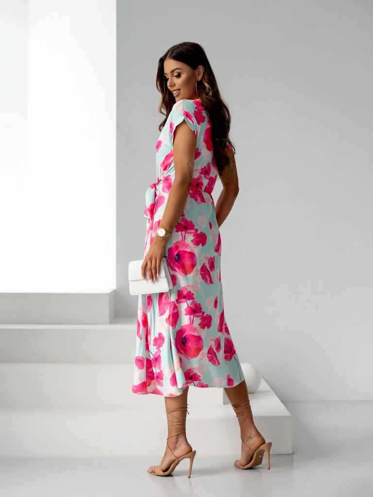 Midi šaty Royalfashion pro ženy s krátkým rukávem, překládaný výstřih v jarních květech