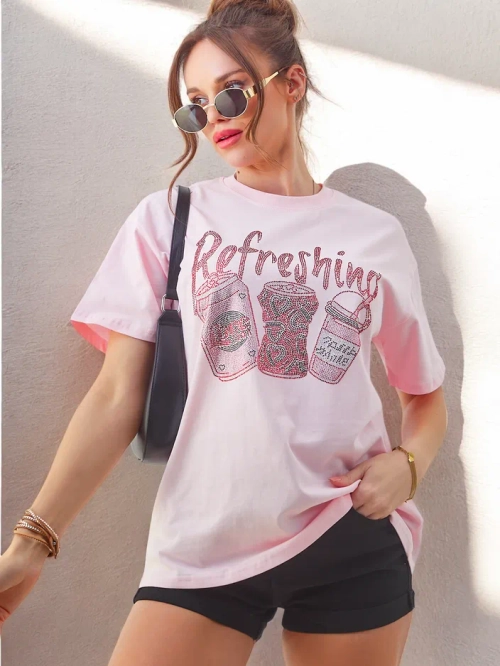 - Dámské bavlněné tričko s potiskem zdobeným kamínky, které kombinuje pohodlí s jemným leskem. Ideální pro casual styl, dodává jedinečný šarm každému vzhledu.