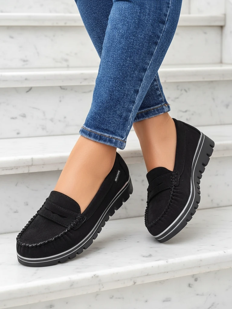 Objevte nové černé mokasíny Sabella, které kombinují eleganci s výjimečným komfortem. Tyto boty jsou vyrobeny z vysoce kvalitní ekologické semišové kůže a vypadají nejen stylově, ale také dbají o životní prostředí. Přírodní kůže stélky zajišťuje dokonalou ventilaci a měkkost, díky čemuž je jejich nošení po celý den čistým potěšením. Díky plochému podpatku o výšce 3,5 cm jsou tyto mokasíny ideální jak do práce, tak na neformální setkání s přáteli.