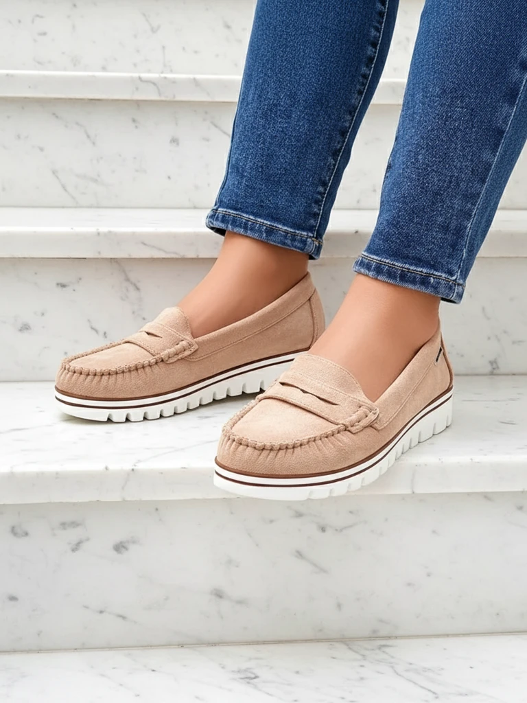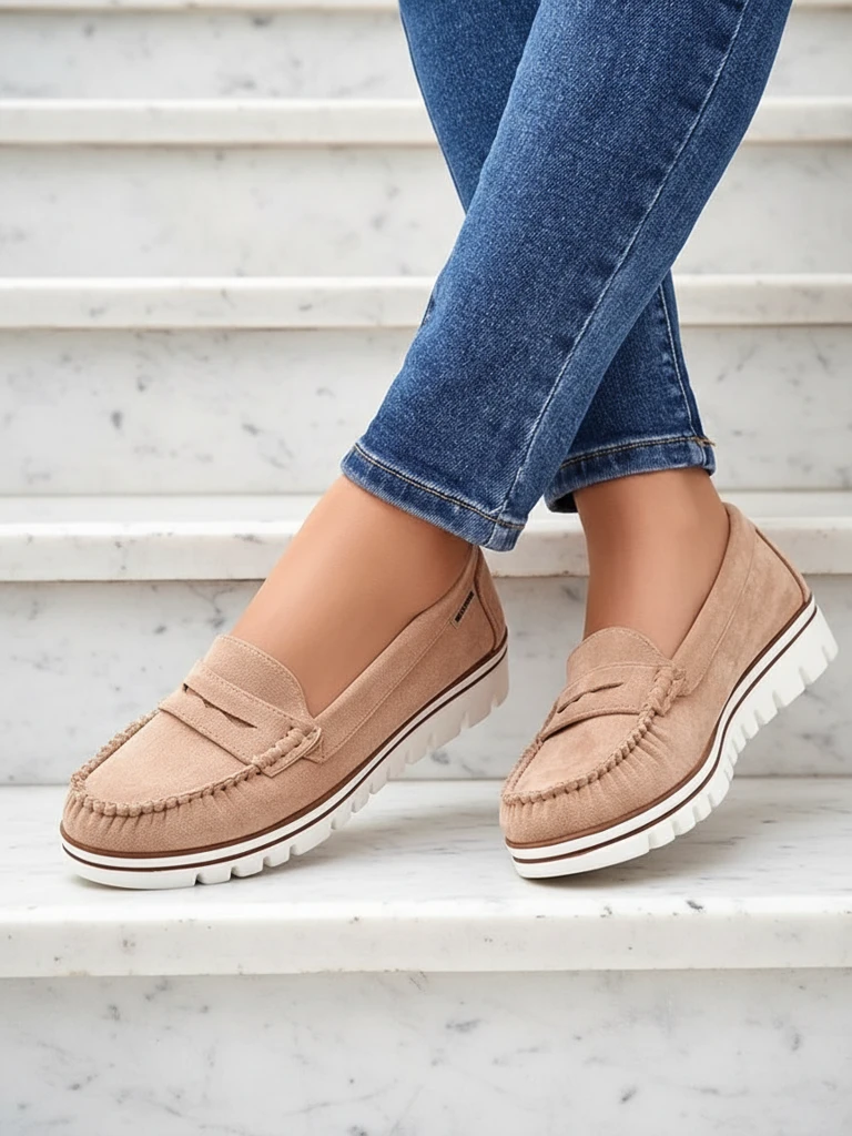 - Lehké dámské mokasíny na ploché podrážce. Model v ležérním stylu je vyroben z ekologické semišové kůže, stélka je z přírodní kůže. Ideální pro jarní outfity!