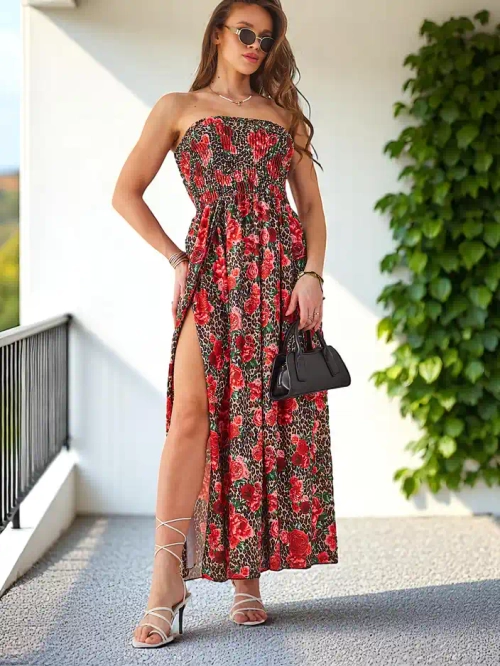 - Kvetované bezrukávové midi šaty se širokým elastickým páskem v oblasti poprsí a decentními rozparky dole. Lehká a ženská, ideální na letní dny! POZNÁMKA: Přesnost měření (+/-) 1 cm.
