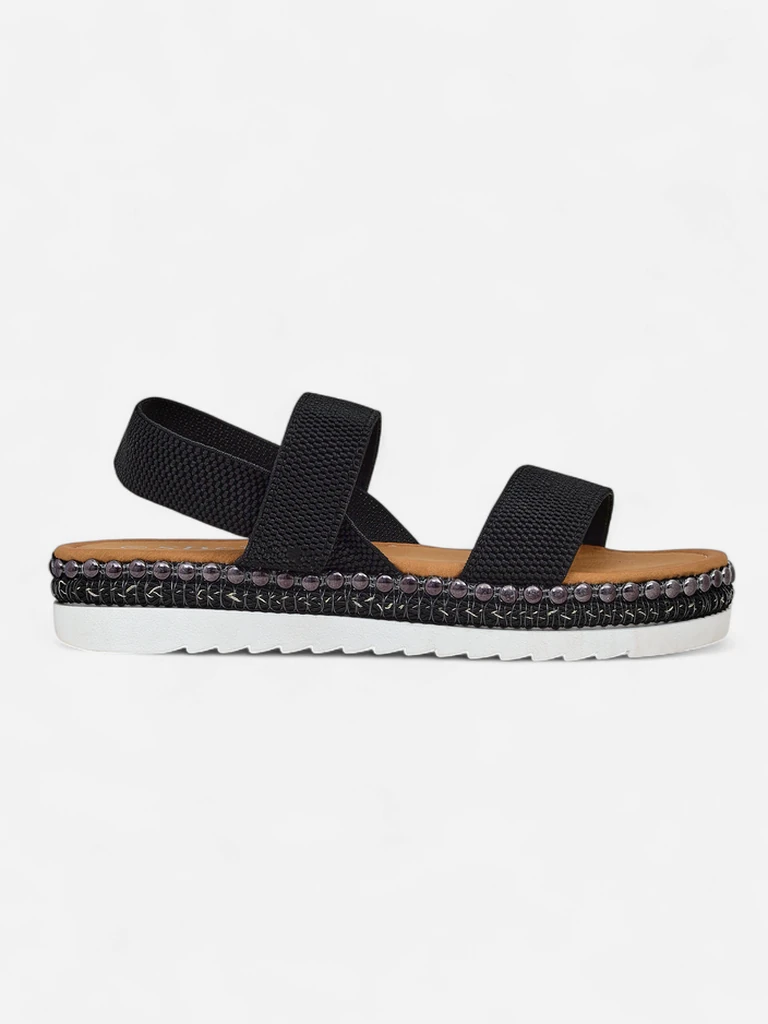 • Sandály pro ženy na nízkém podpatku - skvělý nápad na horké letní dny. Model je vyroben z textilu a ekologické kůže. Podešev je zdobena dekorativními nýty. Nazouvací obuv. Kombinace stylu a pohodlí!
