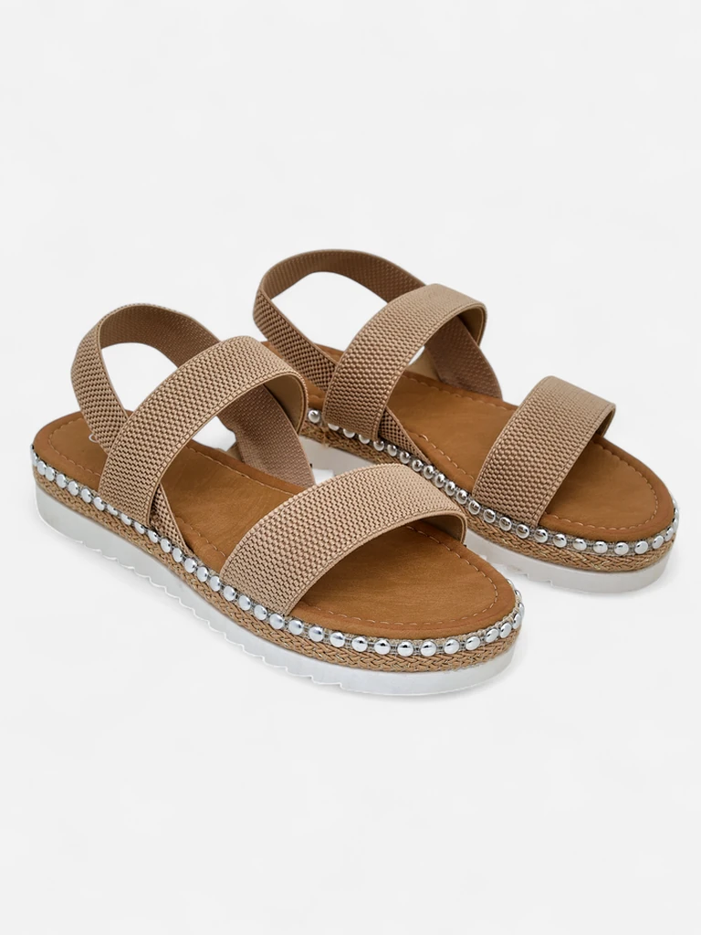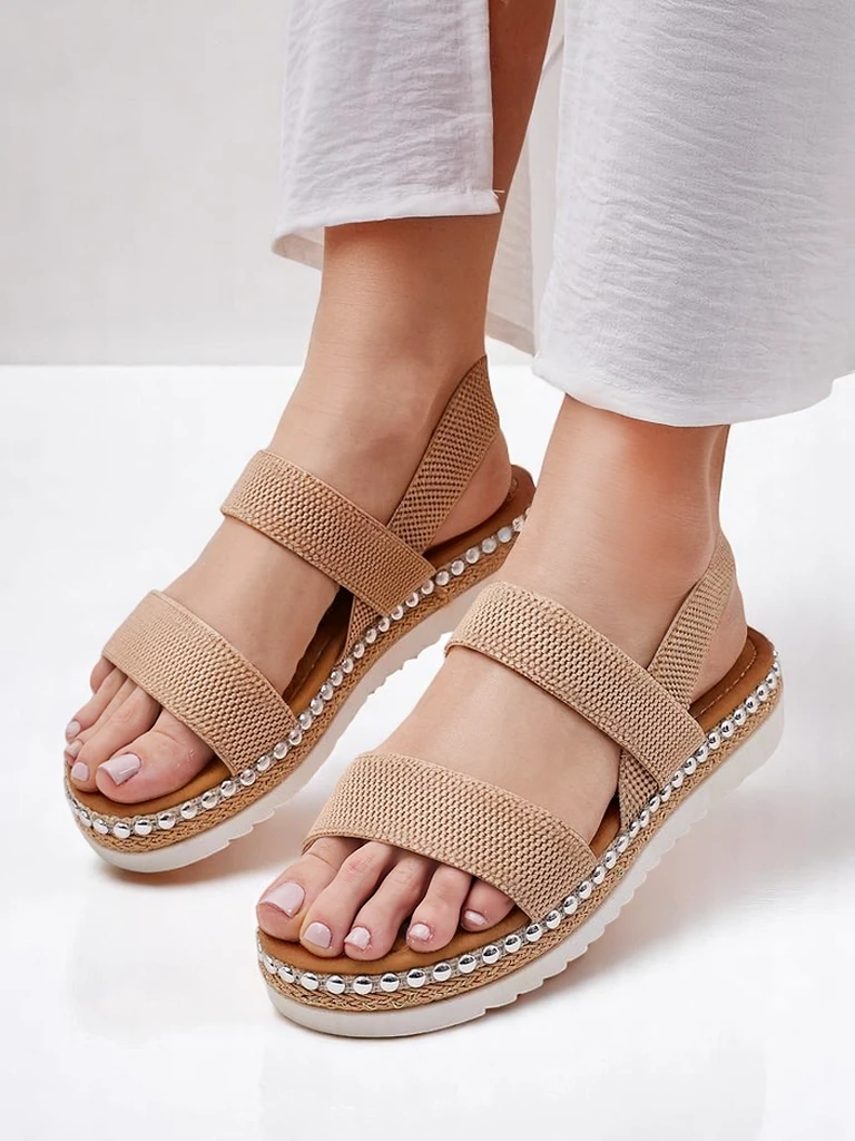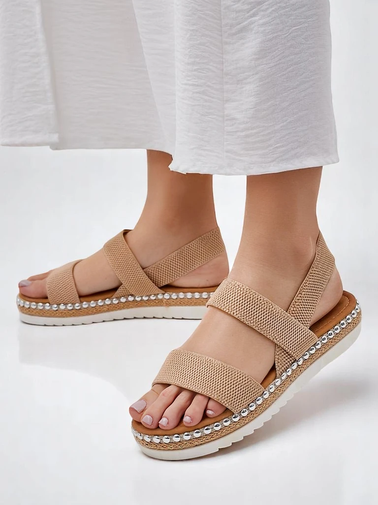 - Sandály pro ženy na nízkém podpatku - skvělý nápad na horké letní dny. Model je vyroben z textilu a ekologické kůže. Podešev je zdobena dekorativními nýty. Nazouvací obuv. Kombinace stylu a pohodlí!