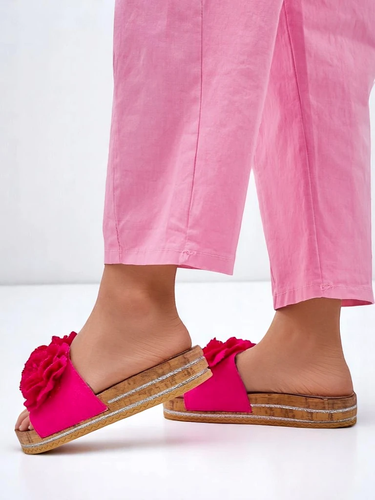- Krásné dámské pantofle vyrobené z umělé semišové kůže, zdobené květinami. Gumová podrážka zdobená materiálem připomínajícím korek a kamínky. Model v zajímavé barevné kombinaci. Perfektně doplňuje letní outfity!