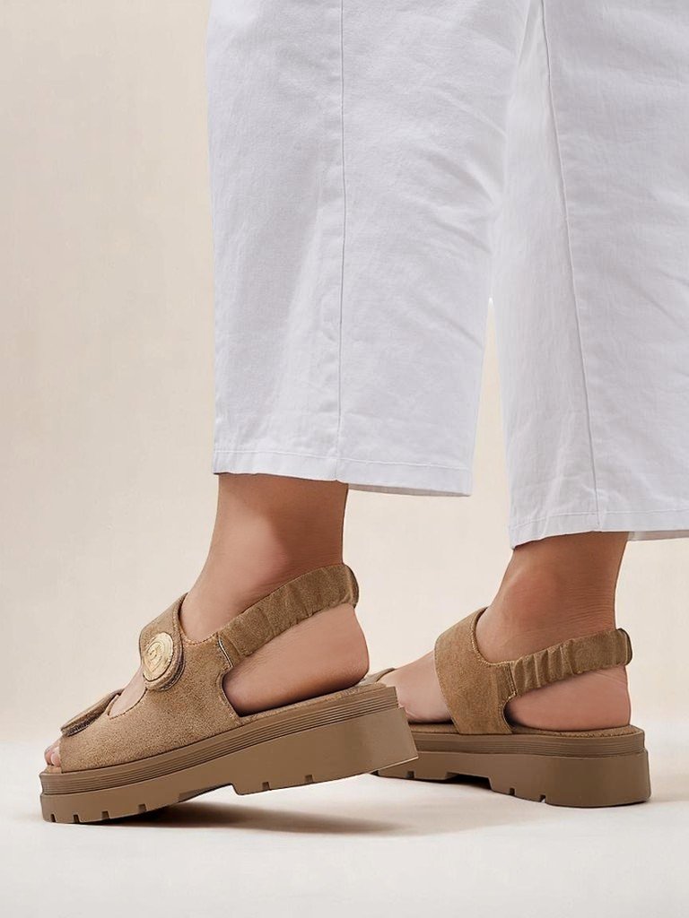 Objevte lehkost a výjimečné pohodlí s dámskými sandály Royalfashion Callista inspirovanými italským stylem. Model je vyroben z vysoce kvalitní eko semišové kůže, a to jak zvenku, tak i uvnitř (vložka), což zajišťuje měkkost, prodyšnost a příjemný dotek pro pokožku nohou. Platforma o výšce 5 cm vyrobená z lehkého, elastického materiálu zaručuje skvělé tlumení a pohodlí i při delších procházkách. Zapínání na suchý zip umožňuje rychlé přizpůsobení individuálním potřebám a absence špičky zajišťuje dokonalou ventilaci – ideální řešení pro teplé dny. Výrazným prvkem modelu je módní, minimalistický design bez vzorů a dekorativní akcent připomínající minci ve zlaté barvě, která dodává celku subtilní eleganci. Sandály dokonale zapadají do aktuálních trendů – masivní platforma, béžové odstíny a přírodní materiály kralují tuto sezónu na molech i v ulicích měst.:- měkká, k pokožce přátelská podšívka z eko-semiše,- elastická podrážka zvyšuje komfort nošení každý den,- lehké a stabilní – ideální jak na procházky, tak i do práce,- zapínání na suchý zip umožňuje rychlé sundání a obutí obuvi,- neutrální, béžová barva se hodí k většině stylizací.:1. Pro každý den – zkombinujte sandály s bílými 7/8 džíny a oversize lněnou košilí nebo tričkem. 2. V boho stylu – slaďte s letními maxi šaty s květinami a velkou košíkovou taškou.3. Městský ležérní styl – vyberte si k pastelovým šortkám a lehkému kardiganu.:Pro zachování svěžesti a estetiky čistěte sandály jemně vlhkým hadříkem a kartáčkem na semiš. Vyhýbejte se kontaktu s vodou a dlouhodobému vystavování slunci. Skladujte na vzdušném místě, nejlépe v plátěném sáčku, abyste zabránili deformacím. Vyberte si sandály Royalfashion Callista, pokud si ceníte modernosti, pohodlí a nadčasové elegance. Tento model se jistě stane vaším letním favoritem, bez ohledu na příležitost.