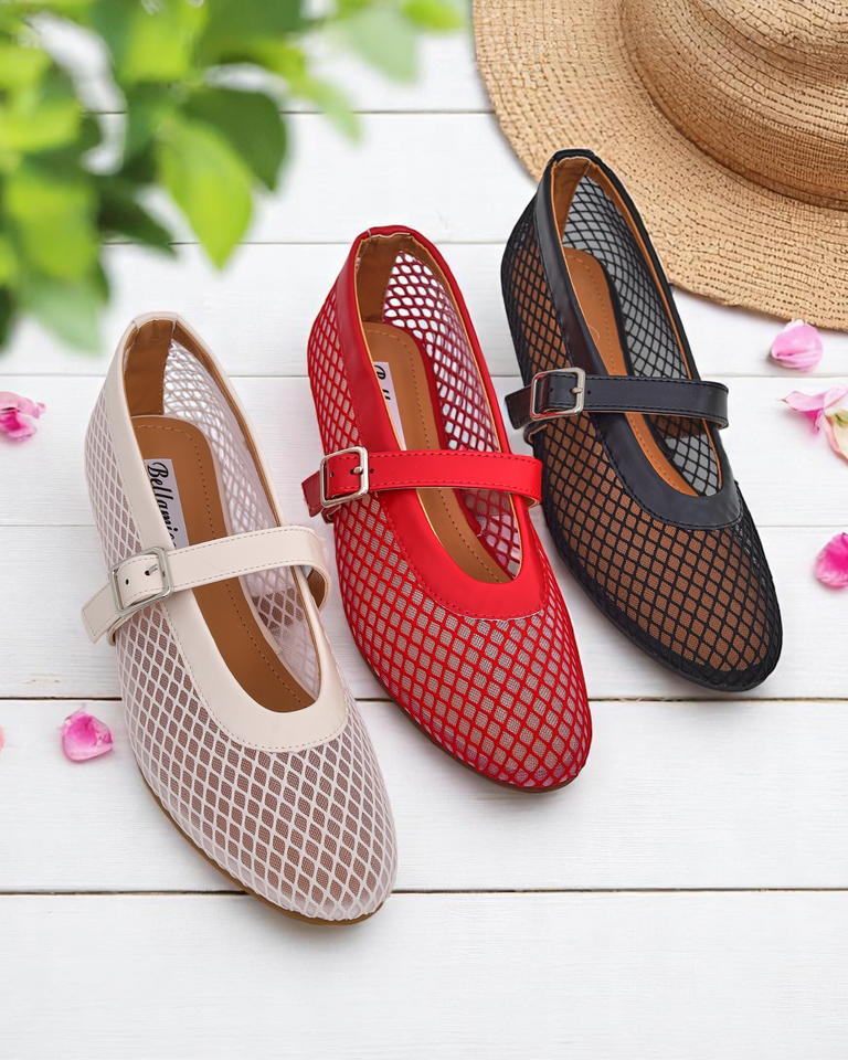 - Výjimečné baleríny z vyřezávané textilie. Svršek je zdoben pásky. Pohodlí zajišťuje měkká stélka z eko-kůže a pásek drží botu dokonale na noze. Jsou ideální pro módní outfity!
